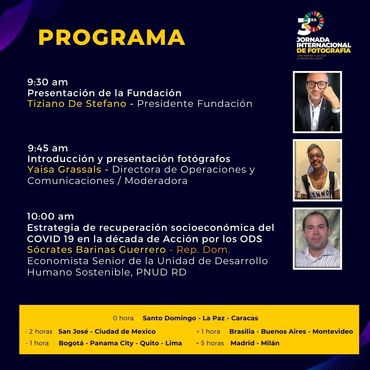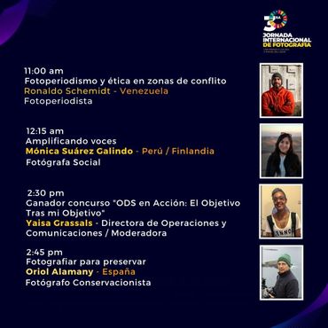 En esta Jornada contaremos con la participación de 5 destacados y reconocidos fotógrafos y fotógrafas de diferentes lugares del mundo de habla hispana y de un experto en materia de ODS, miembro del Sistema de Naciones Unidas en el país. Abordaremos temas relativos a las condiciones de vida de los niños en diversas regiones del mundo (trabajo infantil, violencia, salud y discapacidad), cambio climático, conflictos políticos y sociales, historias de poblaciones indígenas, y conservación de la naturaleza.