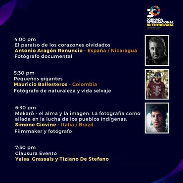 Las conferencias contarán con la participación de destacados y reconocidos fotógrafos de diferentes lugares del mundo de habla hispana, que han obtenido premios internacionales en prestigiosos concursos como World Press Photo, International Photojournalism Awards, Premio Internacional de Fotografía Humanitaria Luis Valtueña, Premios Nacionales de Periodismo Fotográfico, Festival Internacional de la Imagen FINI (Colombia), entre otros festivales regionales e internacionales de fotografía. De igual manera, cuentan con publicaciones en revistas y periódicos como National Geographic, The New York Times, BBC Wildlife Magazine, The Guardian, El País, Hola y Marie Claire.